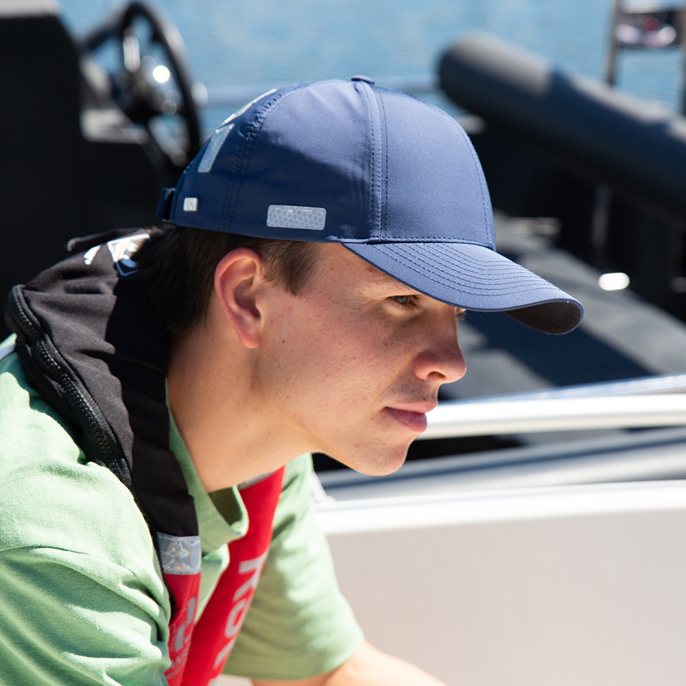 Capsen er laget av et lett soft-shell materiale som gjør capsen vindtett og vannavvisende. På baksiden finner du et festepunkt for strobelys og SOLAS godkjente reflekser. I tillegg har den vår justerbare nylonstropp med ringer i rustfritt stål, slik at du enkelt kan finjustere størrelsen.