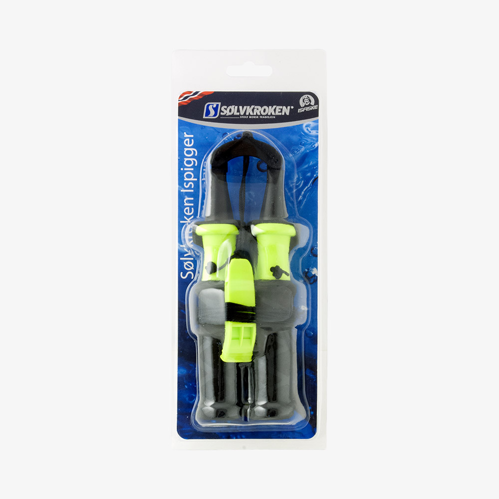Husk ispigger på isen! Sølvkrokens ispigger har snor og varselfløyte. Gummierte håndtak som gir et godt grep.